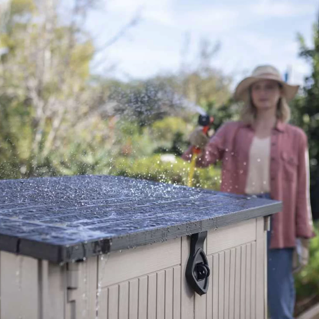 Desde herramientas de jardinería hasta almohadones de muebles de exterior, juguetes de niños, tachos de basura y mucho más, todo puede tener su lugar en este gabinete. Incluso puede ser utilizado para almacenar productos de limpieza de piscinas o como cuarto de máquinas para el sistema de filtrado de la piscina.